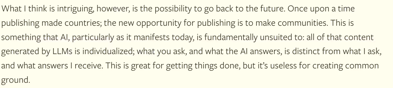 - Content–first plays. One of these things you cannot unsee once you start building yours. Simas started Bloom Labs writing about biodiversity credits. Austejos blogas was already super popular before the launch of the first kindergarten (reputation + lead gen). Mokesciu sufleris is another smart model: monetising information when it is both high-value + updates at high-frequency (certainly Jim VandeHei building Politico Pro was genius move in this). To put things into AI perspective, Ben Thompson just dropped a great piece, called Content and Community.