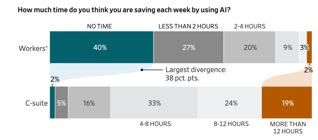 - This is very interesting, looks like AI is supercharging executives, while workers get much less of an impact? WSJ reports.