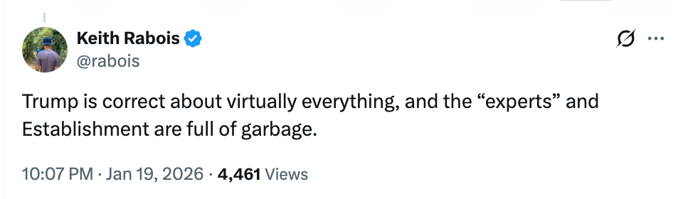 - Trump goes TACO on Greenland, and Noah Smith finds signals of capital flight from the US. So stocks may rebound, but harm will stay.
